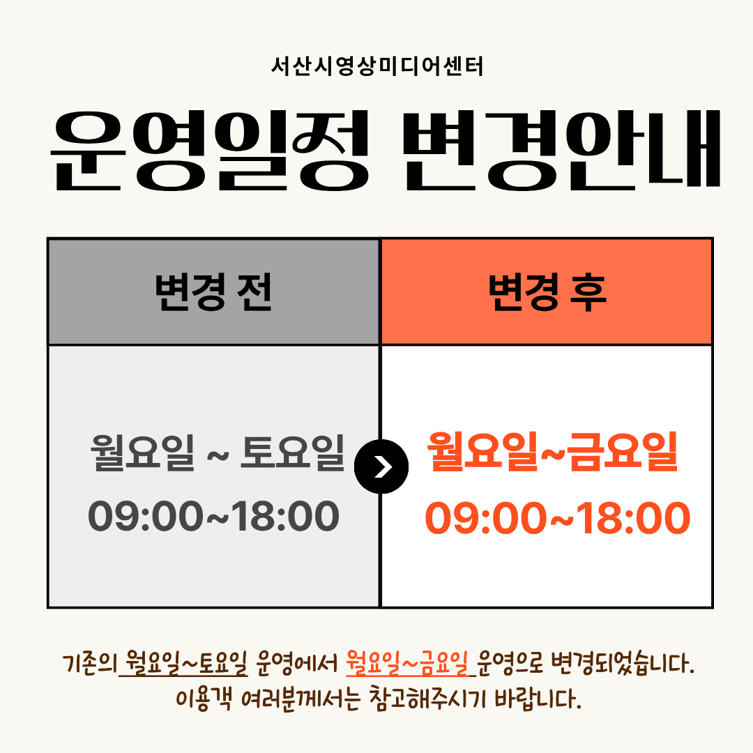 서산시영상미디어센터 운영일정 변경 안내 페이지 정보 작성자 관리자 작성일26-01-14 본문 안녕하세요. 서산시영상미디어센터입니다.센터 운영 일정이 변경되어 안내 드립니다.기존 월요일~토요일 운영에서 월요일~금요일 운영으로 변경되었습니다.이용객 여러분들은 참고해주시기 바랍니다.감사합니다. LIST 다음글